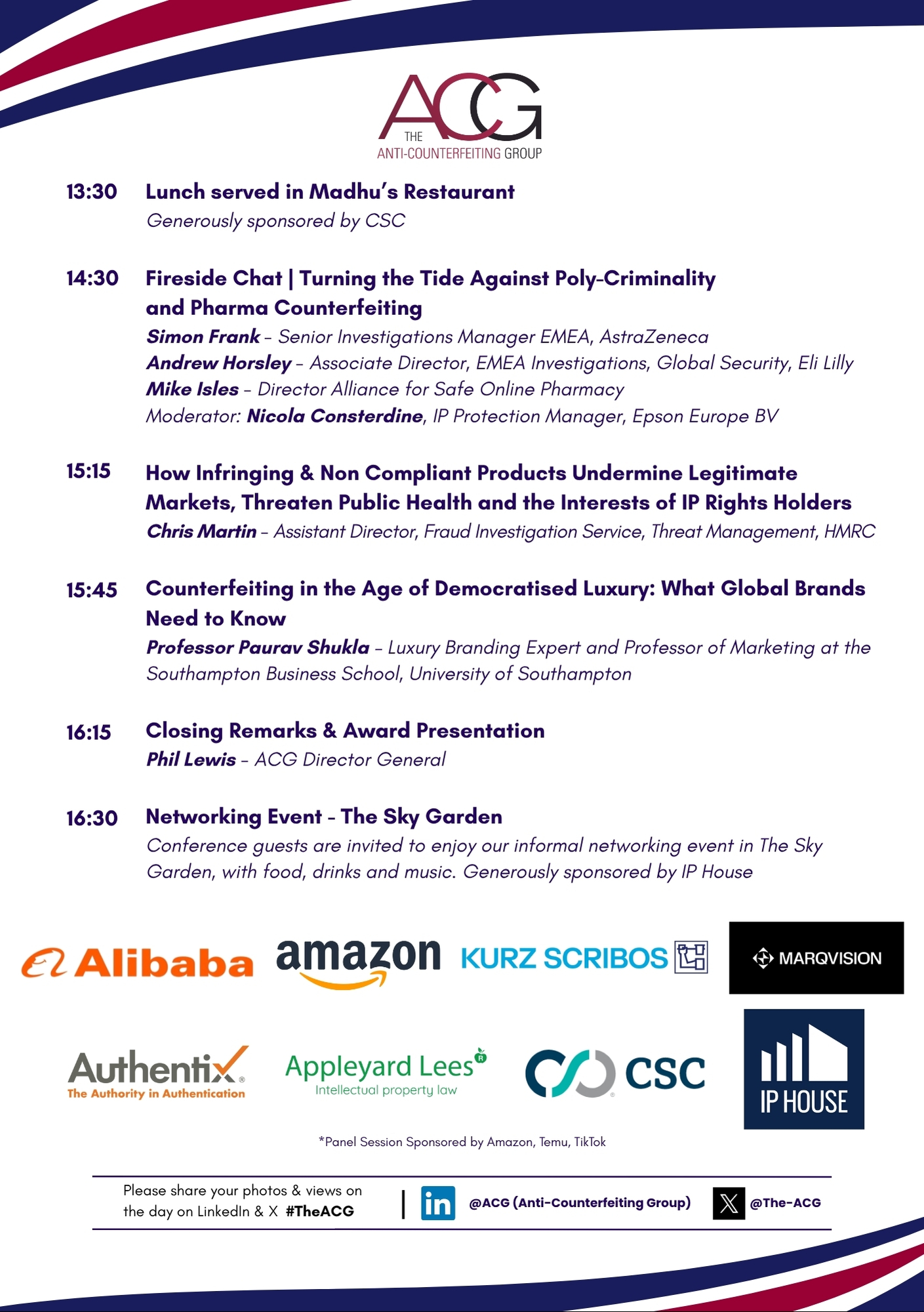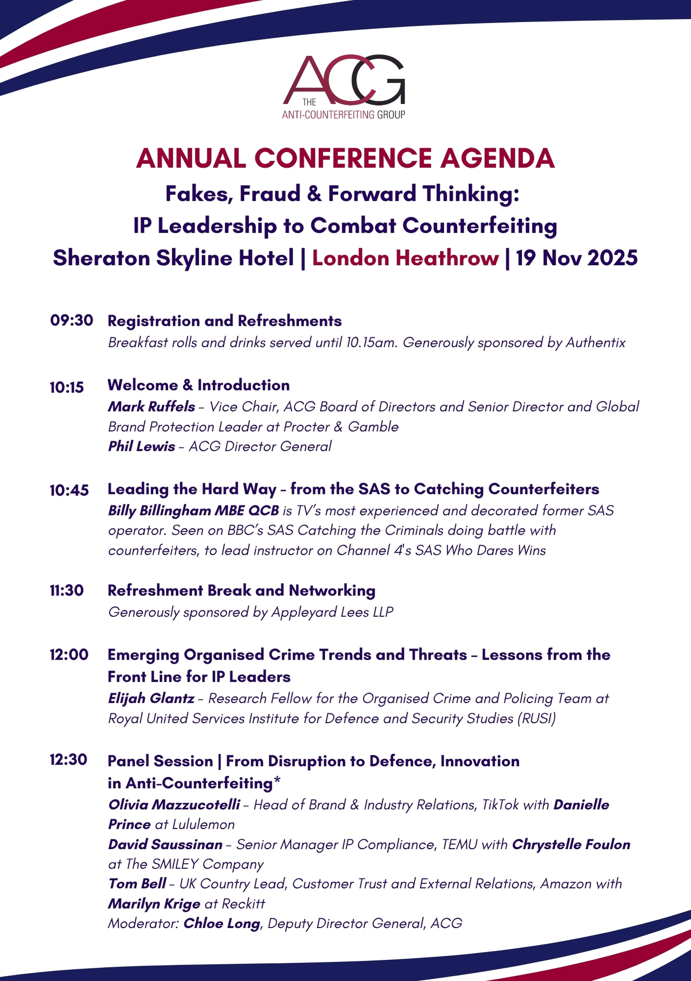 ACG’s Annual Conference is the ONLY high level national opportunity to meet IP policymakers and innovators, brand protection management, senior law enforcement executives, academics, researchers and international partner organisations in the same room. Networking is a major benefit of attending, whilst the conference programme is structured to allow the most complete and authoritative IP and illicit trade dialogue available to attendees.